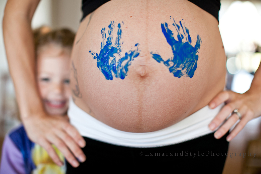 Now that Charley is a big 4 year old you can barely see what is left of the little dimples on her hands. I thought it would be a fun way to remember her hand size at 4 on my belly at 28 weeks pregnant. She always loves to paint but was super excited about being able to put paint on me!
